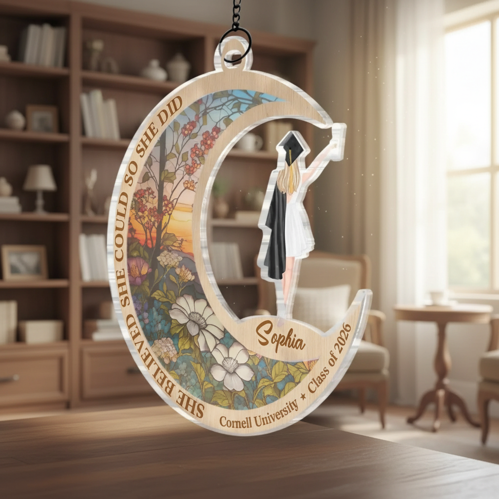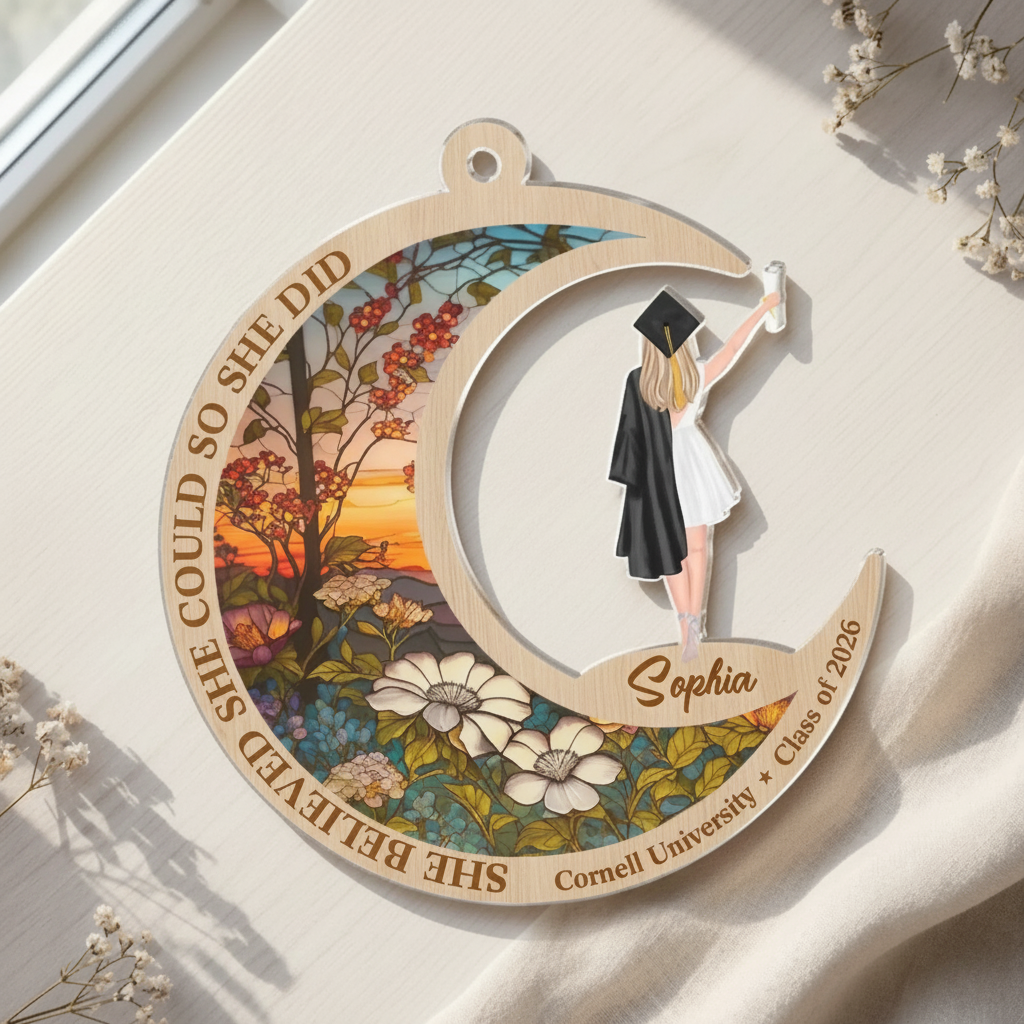 Celebrate a graduate's achievement with this inspiring suncatcher ornament. Featuring the empowering message "She Believed She Could, So She Did," this personalized piece captures the determination and success of graduation day. Crafted with vibrant acrylic, the suncatcher catches light beautifully, casting colorful reflections wherever it hangs. Perfect for dorm rooms, bedroom windows, or as a keepsake on a shelf, it serves as a daily reminder of perseverance and accomplishment. Personalize with the graduate's name to make it uniquely theirs. An ideal gift for sisters, brothers, and family members marking this milestone moment. Whether displayed in a window or hung as an ornament, this meaningful piece celebrates their journey and bright future ahead.