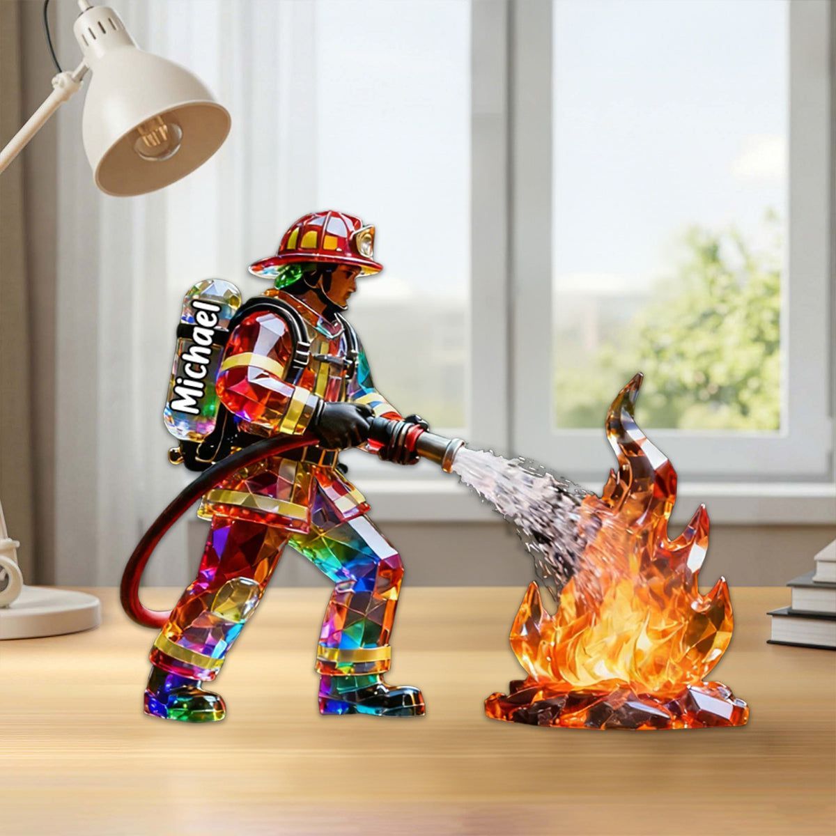 Firefighter Figurine Stained Glass Crystal Effect Personalized Acrylic Plaque, Firefighter Gift