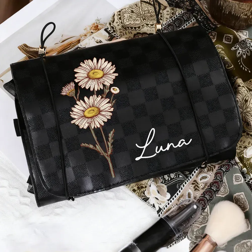 Personalized Birth Flower Dainty PU Leather Makeup Bag with Name Travel Essentials Daily Use Birthday Gift for Women