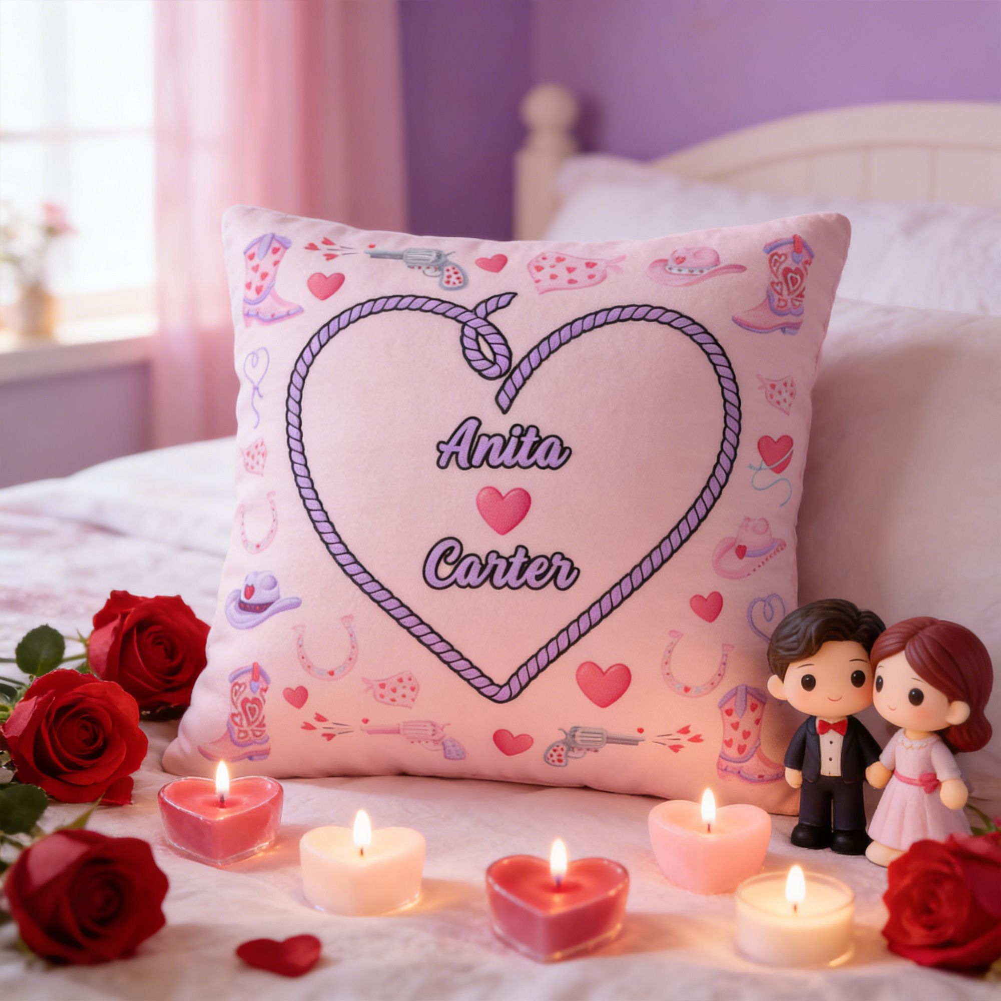 Personalized name denim heart-shaped pink throw pillow cover with insert, home decor, Valentine's Day gift for couples.